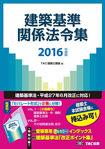 建築基準関係法令集 2016年度版 |建築士|TAC出版書籍販売 ~ 建築基準関係法令集 2016年度版 本体2800円(税別) B5判 936ページ(上巻440P・2C、下巻496P・1C) 1冊でも、2冊に分解しても使える「セパレート形式」を採用しました。 参照頻度が最も高い建築基準法等を上巻 に、 その他関連
